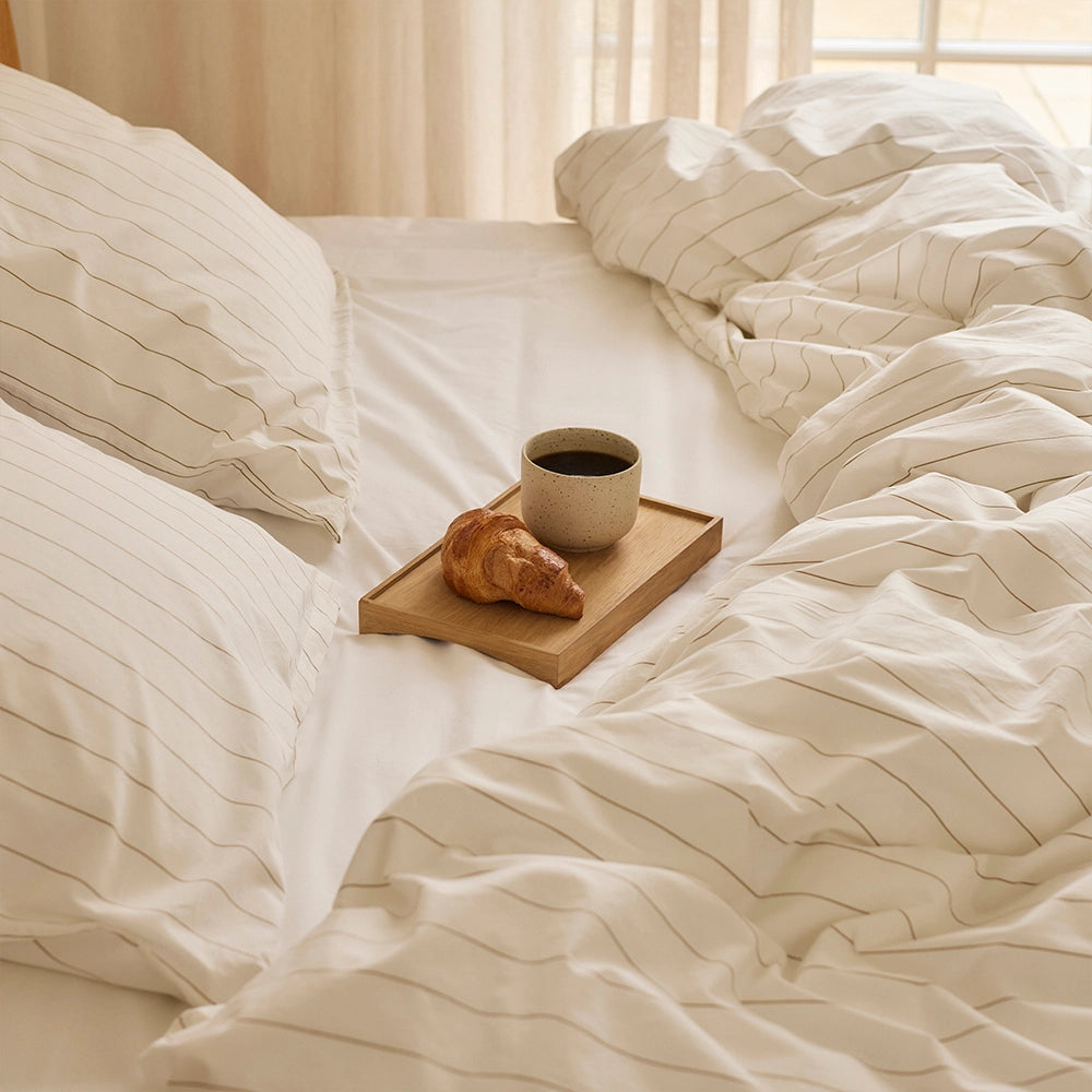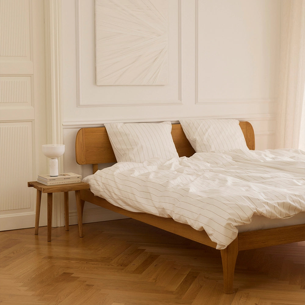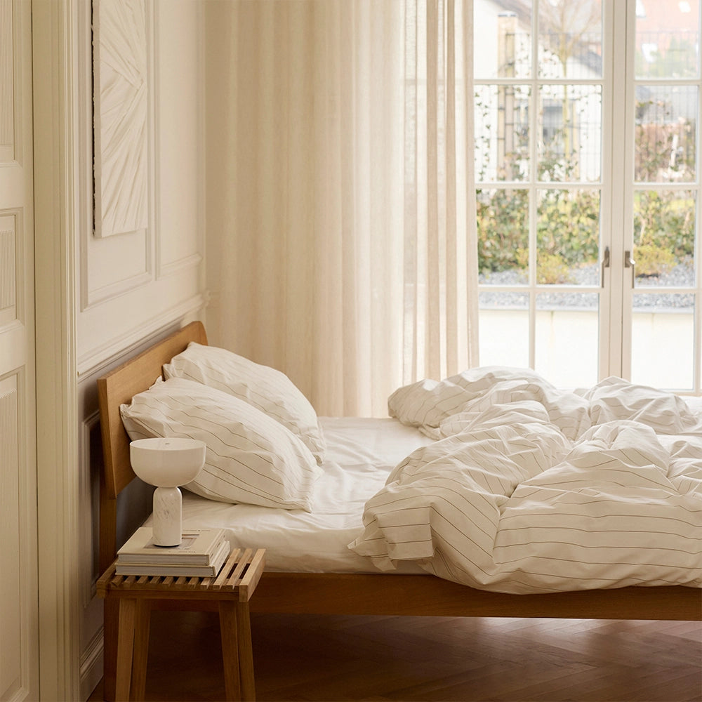 De hvide striber giver et stilrent nordisk udtryk, der passer til både klassiske og moderne soveværelser, mens stoffets åndbare struktur sikrer en behagelig søvn nat efter nat.