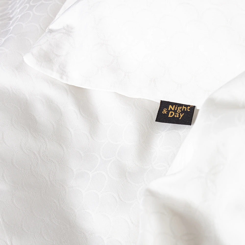 Du får med dette sæt en harmonisk blanding af funktion og finesse – ideel til dig, der lægger vægt på både æstetik, velvære og langtidsholdbarhed. Den hvide farve skaber et roligt og elegant udtryk, mens jacquardstrukturen tilføjer visuel og taktil dybde – hverken prangende eller prætentiøs, men stadig raffineret og tidløs.